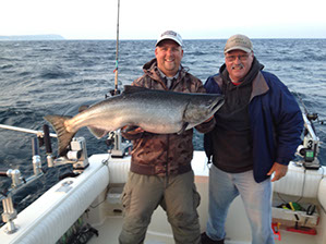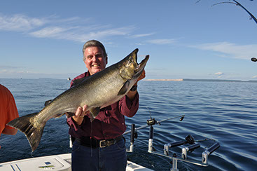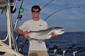 Once the summer walleye fishing begins to slow, In The Net Charters packs up and heads to beautiful Frankfort, Michigan for summer salmon. This is your opportunity to catch big Lake Michigan King Salmon. The King Salmon offers one of the best fights in the Great Lakes. Fish range in size from 12 to over 20 pounds with battles taking up to 20 minutes. Come join us for this scenic trip with beautiful views of Sleeping Bear Dunes and Point Betsie Lighthouse!
